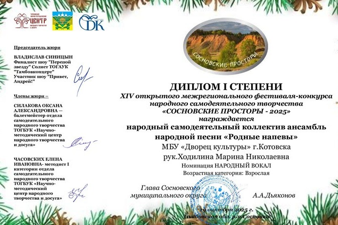 Коллективы «Котовская задоринка» и «Родные напевы» заявили о себе на XIV межрегиональном фестивале-конкурсе народного самодеятельного творчества «Сосновские просторы», направленном на сохранение и развитие народных традиций. Руководит коллективами Марина Ходилина. Артисты под её началом продемонстрировали высокий уровень мастерства, заслуженными наградами стали дипломы I степени.