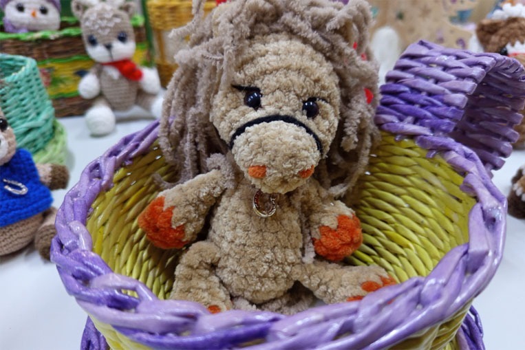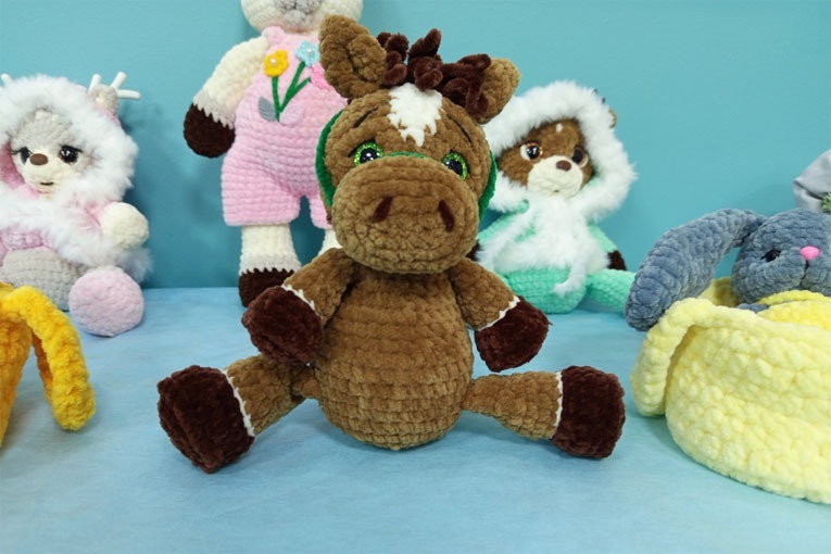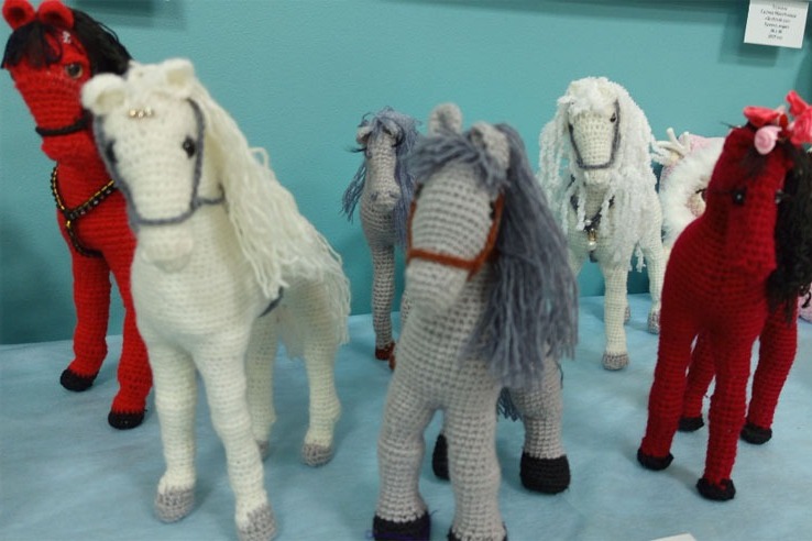 Рядом символы следующего, 2026 года – вязаные лошади. Целый табун грациозных животных представила Нина Жупиева. Красотой и нежностью удивляют изделия и её коллеги по творчеству Валентины Свиридовой.