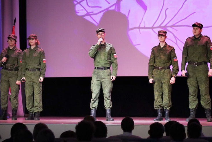 Будущим защитникам Отечества показали волнующие патриотические видеосюжеты, а среди концертных номеров, предложенных юными артистами школы, были танец на мотив песни «Богатырская», песня «Только за Россию».